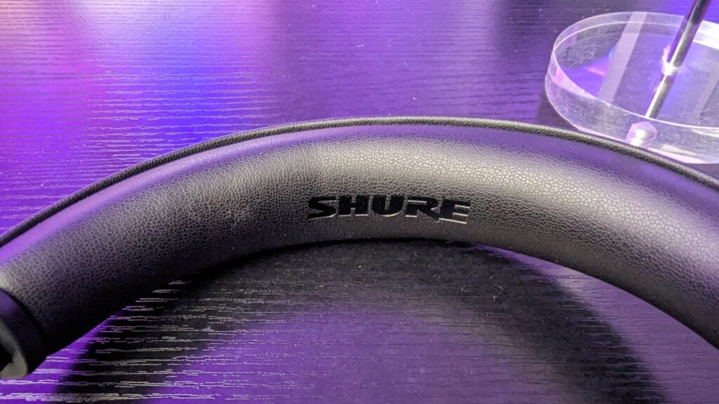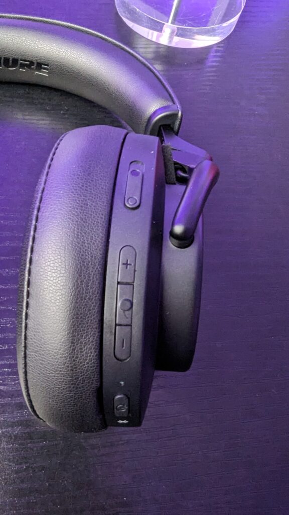 On the right earcup, you can find several buttons and a single slider. Let’s now run through what everything does here, and I will say for the most part everything is pretty simple. The bottom button is your power button. One press turns the headphones on and off. A double press gives you a battery life status and a small long press turns them on and off, and a longer press enables pairing. Above this is a volume rocker and centre button and this is where I am a little confused about Shure’s choices. The volume rocker ONLY turns the volume up and down, whereas the centre button acts as a way to play/pause music and answer calls with a single press, while a double tap skips the track forward and a triple tap skips the track back. Surely it would have made more sense to put volume changes on long presses on the rocker and skip tracks as single presses on the volume rocker or is this just me? Finally above this collection of buttons is a clickable slider which switches between ANC, Environmental Mode and neutral. You’ve got a 3.5mm aux input and a USB Type-C input for charging, of which you can get a maximum of around 20 hours of listening time depending on volume levels and if Environment or ANC mode is switched on.