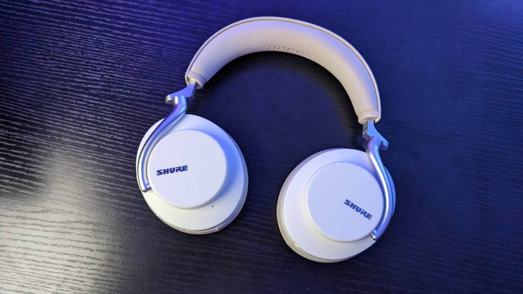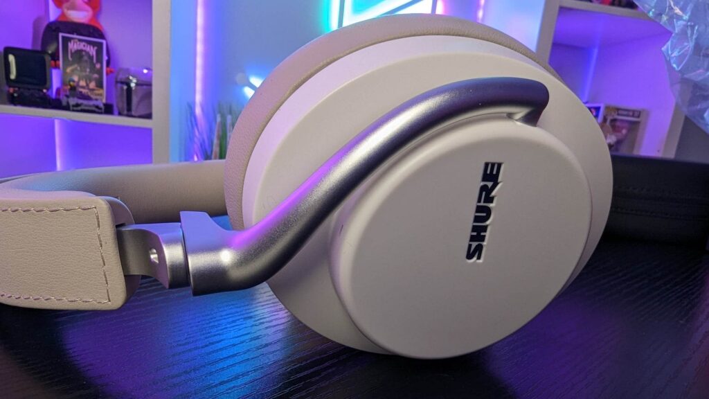 My first impression of the Shure Aonic 50s was that they’re a very large set of headphones. They’re not quite as refined or stealthy as say the Sony XM5s and they’re a little garish by comparison, with chunky earpads, large metal arms that can allow the 50s to lay down flat, and even the headband is thick. But saying this, there is a massive aura of quality about them. The plastic earcups look absolutely great. The double stitching on the headband is quality, and I’ve got a set of white headphones here and they’re simply stunning, in an outlandish kind of way. They do also come in black and brown too if they’re more your colour. It’s refreshing to see a more daring design too as the plain plastic look dominates this high-end headphone market.