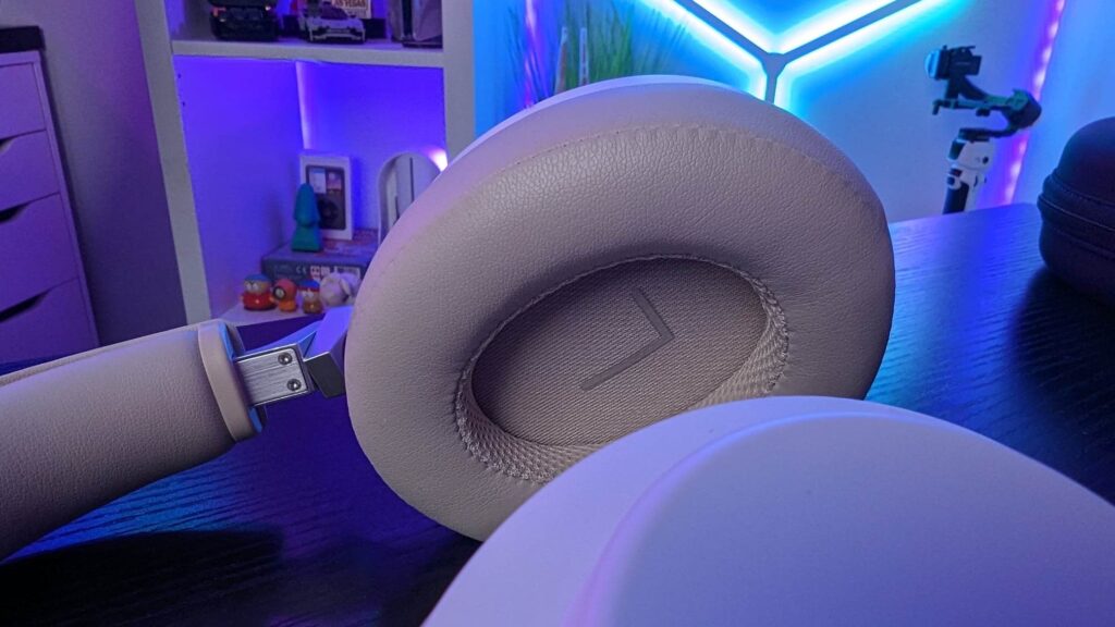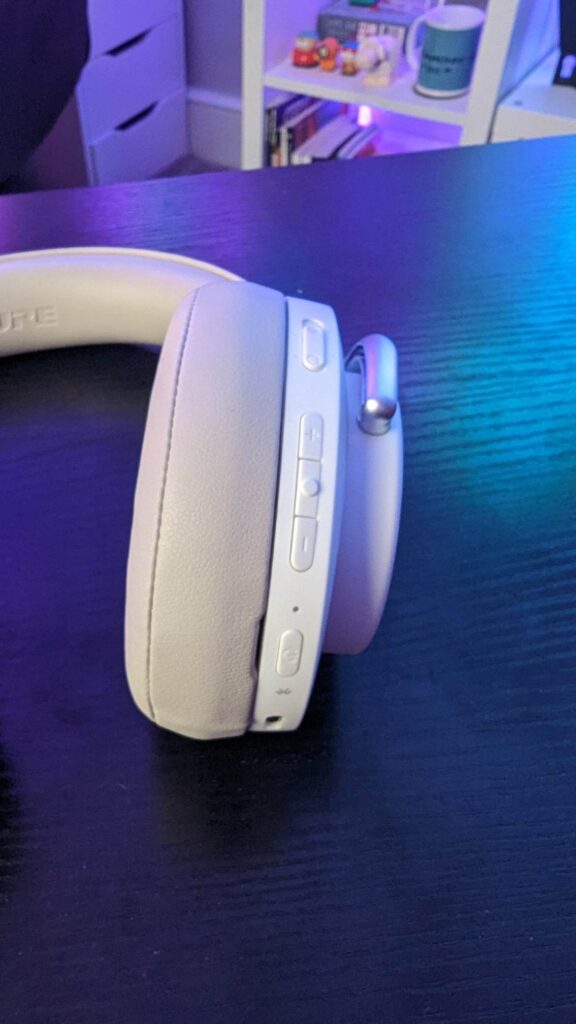 The user interface is placed on the right earcup, which for me makes these headphones controls feel a little crowded, but it does mean everything is within simple reach with one hand. The exception though is the 2.5mm aux input that can be found on the bottom of the left earcup. Notice I said 2.5mm and not 3.5mm, which is awkward if I say so myself. You do get a 2.5mm to 3.5mm cable in the box, but it’s not too simple to replace if you wanted a longer variant. The controls are also pretty simple here. From front to back, the first is a switch so you can choose between active noise cancellation or audio passthrough. The second is your play/pause, skip track and volume controls. Two presses on the Play button will skip forward, three taps will skip back. Underneath that is your power and Bluetooth button, and holding this will activate pairing mode. And finally, a USB Type-C input for charging your device or connecting it to your desktop or laptop, and was recognised straight away on my desktop as a playback device.