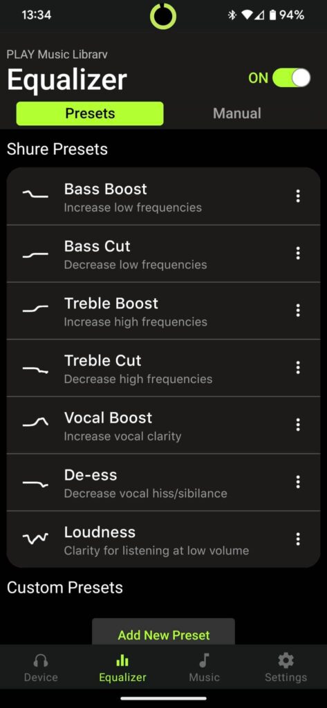 There is a partner app that is available to download on Android and iOS app stores called Shure PLAY, which is designed to give you customisable options to suit your listening style. I ran a firmware update as soon as I connected the Shure Aonic 50s to my phone, so I am running version 0.75.0. The settings here can range from how powerful the active noise cancelling or audio passthrough is to an equaliser. However, one strange thing I found is that the Equaliser will only affect the music you listen to through the PLAY app. So this automatically makes Spotify, Tidal or Google Music or whatever music app of choice you use entirely redundant. Even if the tracks are physically downloaded from your music streaming platform of choice, like mine through Spotify, it still did not recognise that the tracks were on the phone.