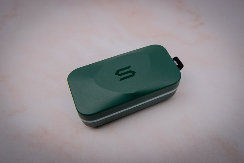 We got the army green version, which includes baby blue innards, which I have to say, I like a lot. The case is compact, lightweight, and easy to carry in your hand, pocket, or clip onto something via the carabiner. To the rear of the case is the UBS C port and small indicator light, plus a small fabric tag on the right-hand side. There is no wireless charging with these. Open the case lid to reveal the earbuds, which sit magnetically into their molds.