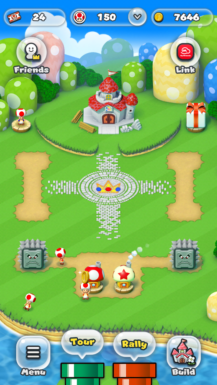 There is also a kingdom which acts as your home screen. You can build things unlocked via the rally or by levelling up and when you get to the higher levels or get enough resources, you can unlock the other characters! You can unlock Luigi, Yoshi and Toadette, with more to follow I hope.