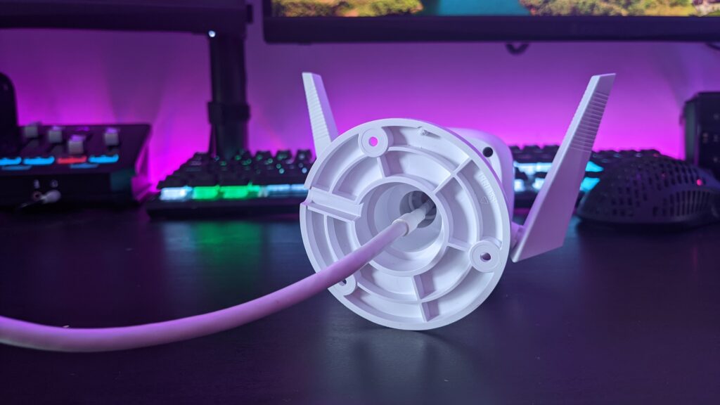 The C320WS is a small, rectangular-shaped security camera. It has two aerials on either side of the main housing, and a simple mounting system to the back. It’s primarily made from plastic to keep the weight down as it’s designed to be hung to the side of your house. There are two cables running from the rear of the camera for power and for Ethernet. The camera is fully wireless, so I didn’t bother running an Ethernet cable through my home, and it only needed power.
