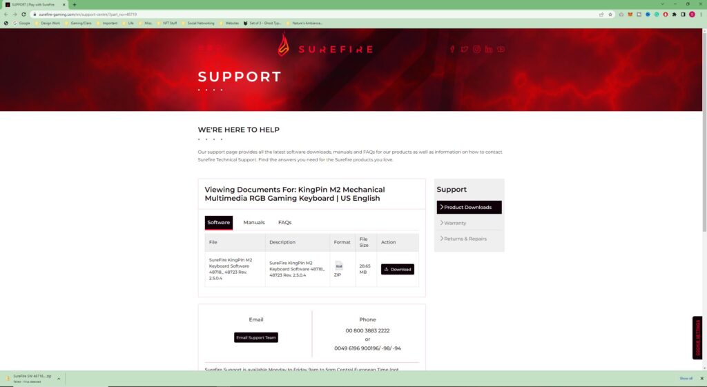So, software time! What was pretty strange was when I was trying to download the Surefire software from their support page, so I could access features to the keyboard, my antivirus detected a virus. It wouldn’t let me open the ZIP file. And to be quite honest with you, in this day and age, I’m not about to start sticking exclusions on my antivirus if it’s already said there’s a virus detected.