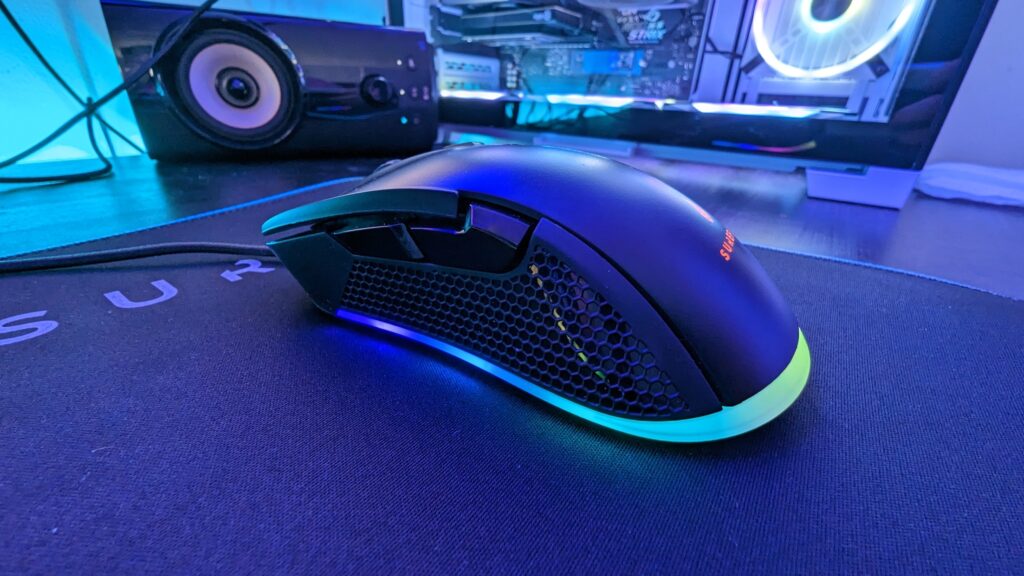 Now this one is a bit of a mixed bag for me. First off, it’s a nice size. I can grip it with a palm grip, and when used with the Surefire Silent Flight mouse pad – love these names by the way – it glides across the surface really nicely and weighs just 133 grams. Though it’s called the Claw it’s definitely too big for a claw grip. Confusing a bit. But, for me, it’s a little skinny, and I would have preferred a bit more of a dome shape, especially regarding the side buttons. The mouse is a bit convex and I feel like my thumb can’t rest against the side of the mouse comfortably. There is a rough surface, unfortunately not made from rubber but it has a hexagonal pattern for grip. The main body of the mouse is made from plastic which is smooth but VERY prone to fingerprints. It has six buttons in total: a left and right click, a middle scroll and click, a DPI switcher below the scroll wheel and two thumb buttons. It’s for right-handed use only which is pretty standard now in the gaming mouse world.