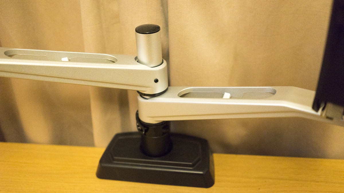 The base attaches to the desk rather easily, with two pressure plates that screw to the rear of the desk so it hooks over. The arms attach together with ease, without the need for attaching screws or fiddling with little allen keys. You’re up in about 15 minutes from when you work out which arm goes where.